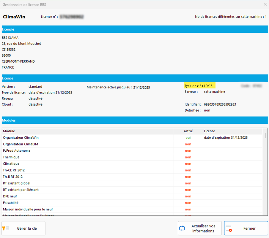 - Si votre type de clé est LDK-SL, cela veut dire que vous avez une clé virtuelle (installée sur poste ou sur un serveur de licence) :
