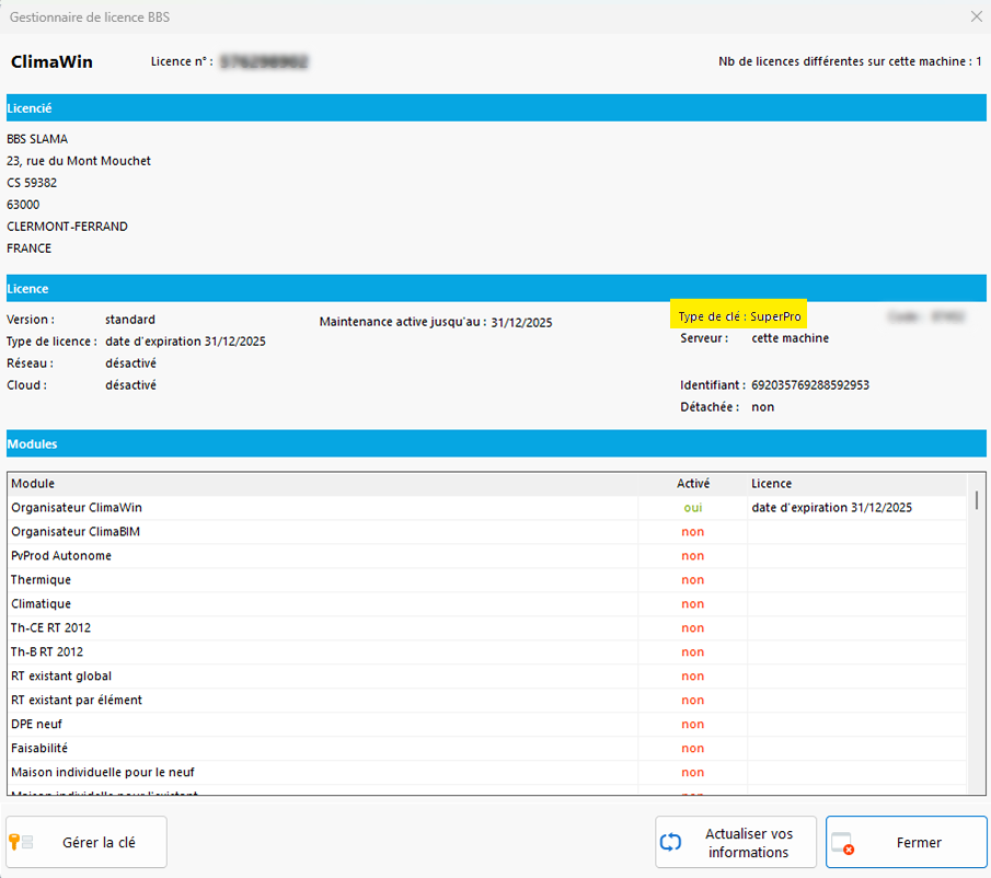 Cela ouvrira une fenêtre vous donnant toutes vos informations de licences, notamment utile à nos technicien pour pouvoir vous dépanner: